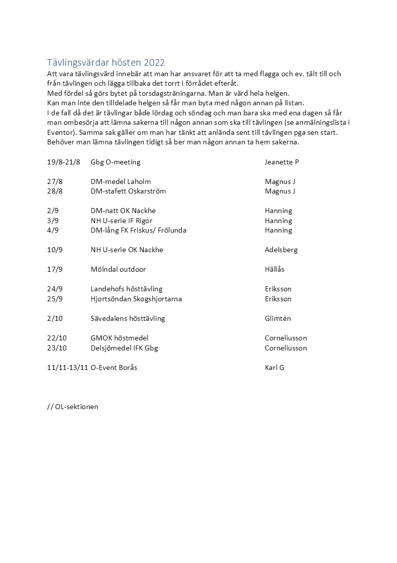 Nu när tävlingarna dragit igång så har vi gjort en ny lista över tävlingsvärdar för hösten. Roligt om man även vill göra en lite skriftlig sammanfattning över helgen och lämna till någon i orienteringssektionen så det kan bli ett litet inlägg på hemsidan. Gärna något bild också om det är möjligt.