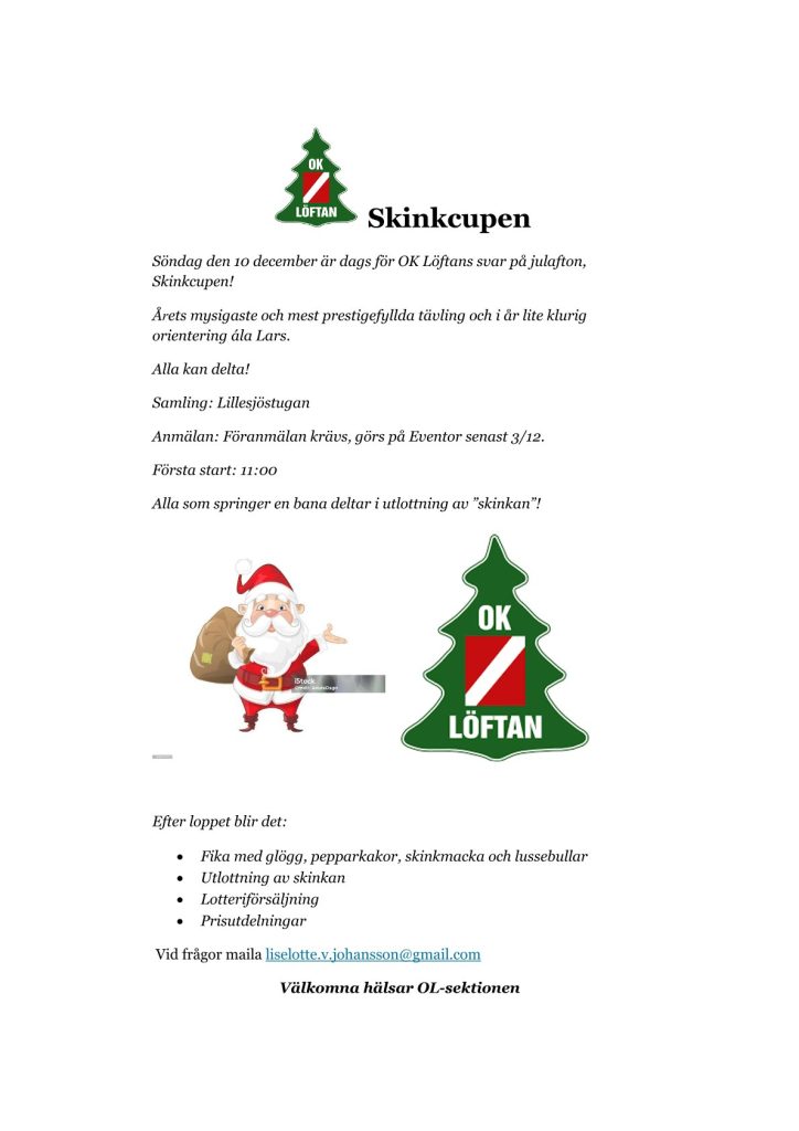 Snart är det återigen dags för vår traditionella skinkcup = julavslutning. Vi behöver snarast ha in anmälning så vi kan planera. Fika och lotter ska ju räcka till alla. Lars H har lagt några banor där svart kommer få någon extra klurig karta. Anmälan via eventor Eventor – Aktivitet: Skinkcupen (orientering.se) alt till [email protected]. Vi behöver ha in anmälningar från alla som kommer närvara, alltså inte bara för de som vill springa en bana.